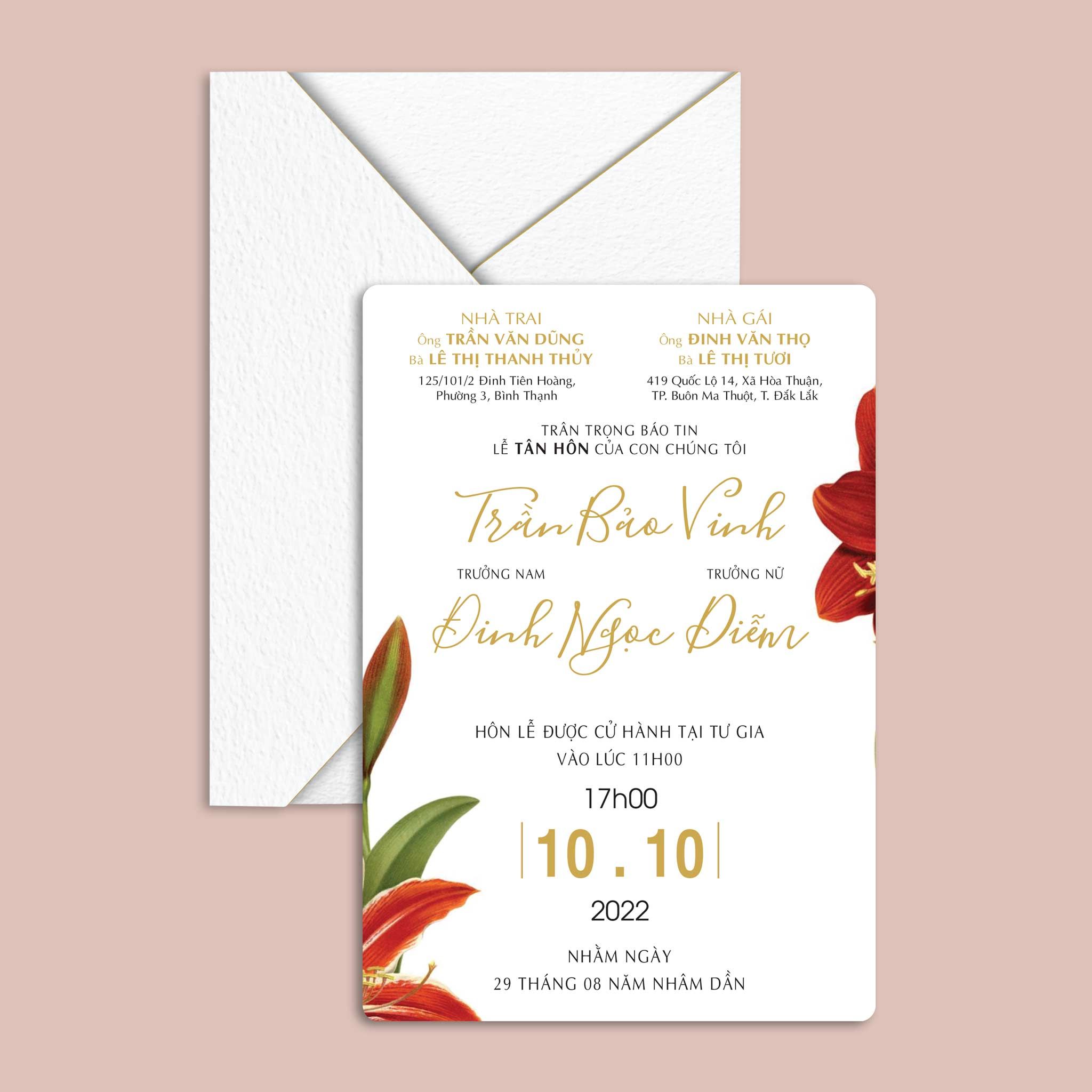 Chất liệu: Có thể lựa chọn in thiệp cưới trên Giấy tiêu chuẩn hoặc giấy mỹ thuật cao cấp