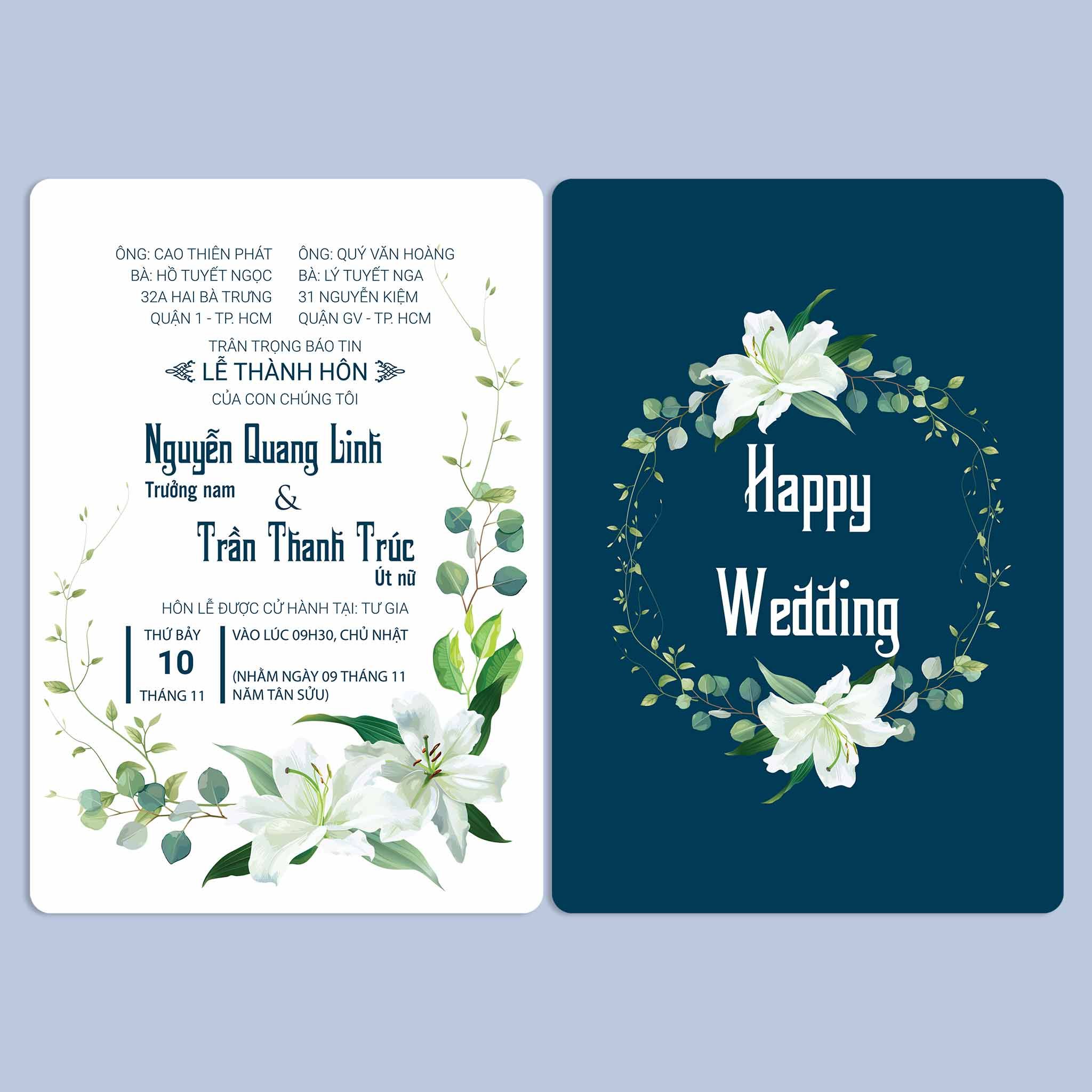 Chất liệu: Có thể lựa chọn in thiệp cưới trên Giấy tiêu chuẩn hoặc giấy mỹ thuật cao cấp